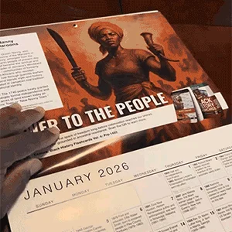 HISTORICAL TRIBUTE - Inspired by the "Power to the People" theme, this calendar honors historical legacies. Each month celebrates figures like Queen Nanny, embodying resistance, leadership, and the enduring strength found within community and heritage.