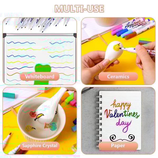 It works as a regular whiteboard marker which is easy to erase on glossy surfaces such as glasses, metal, and plastic.